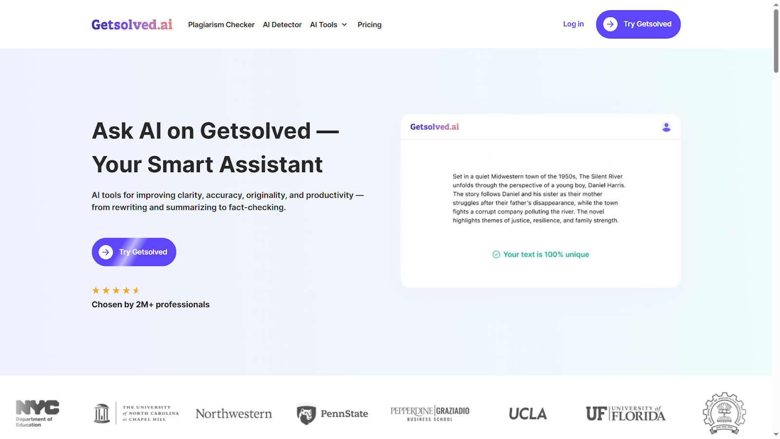 Getsolved.ai stands out because it bundles rewriting, plagiarism removal, and knowledge search into one workspace. Instead of jumping between separate apps, writers manage creation, improvement, and verification in a single environment.
