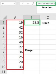 AVERAGE – The AVERAGE function is commonly used in the event that you need to compute the average value based on a given range of cells. For example, assume you need to calculate the average score for a test of a class which consists of 10 students. We can simply use the AVERAGE function to achieve this. In the following example, the average number for the given range is equal to 28.5.