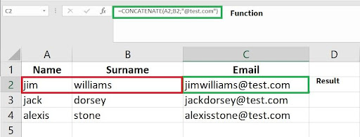 CONCATENATE – The CONCATENATE function is quite useful in the event that we need to combine several values together from a number of data cells or even combine values from data cells with some custom text. For example, if we need to generate an email list based on the personal details of employees, we can achieve this by using the CONCATENATE function to combine employee details with a custom domain. In the following example we use the CONCATENATE function which requires several parameters which could be a combination of data cells (A2 and B2) and can be further combined with some custom text, in this case our custom text is a representation of the email domain “@test.com”. This results in the employee name being combined with the employee surname and then being further combined with the custom email domain to produce an email address. Note that each value in the function is also separated by a semi-colon (;)