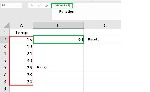 MAX – The MAX function is fairly simple to grasp and pretty much self-explanatory. The MAX function can be used to retrieve the highest value from a given range and returns the result as a single value from a range. For example, if we have a range of data which represents the temperature of a city over a duration of seven days, we can easily retrieve the highest temperature value from a range. In the following example we return the max value from the range A2:A8 using the MAX function where the result is equal to 30.